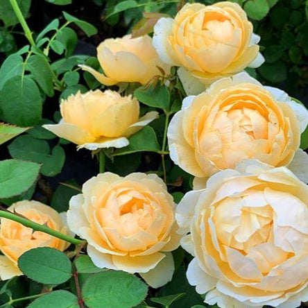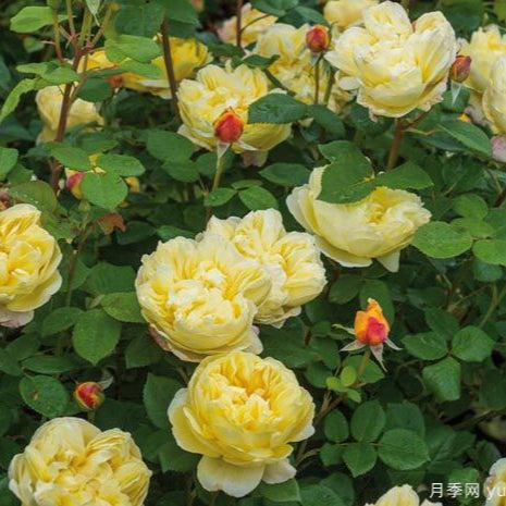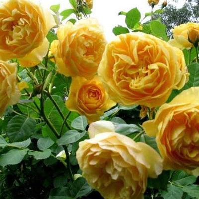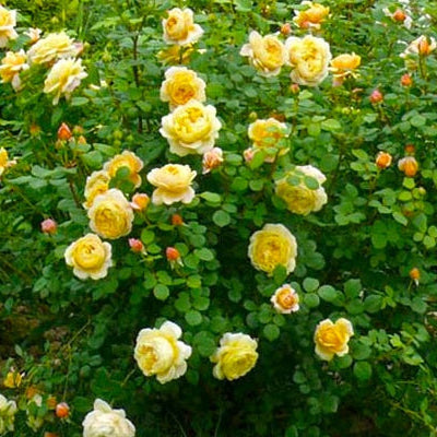 A very desirable English cut rose with golden yellow flowers with slightly whitish underside, big flower, diameter ~4 in, plant height ~4 ft. Repeat flowering for multiple seasons with long flowering period, retro bun flower shape, strong and pleasant tea-lemon mixed fragrances, heat and disease resistant, few thorns, used for garden landscaping or potted plants, impressive ornamental effect.