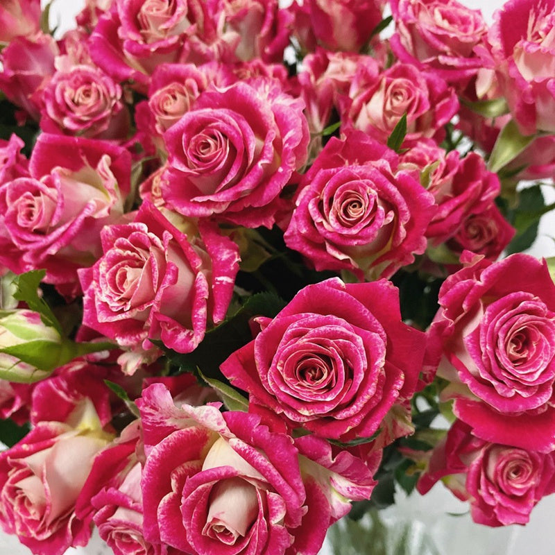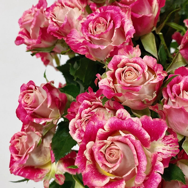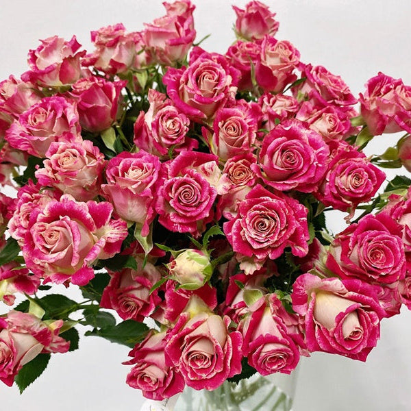 A cut rose with unique pink, yellow, white mixed color shades (look like oil painting). The cup-shaped flowers are multiheaded with diameter ~3 inch, plant height ~4ft. Slight fragrance, long vase life (~20 days), repeat blooming through seasons.