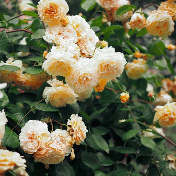An excellent old rose, flower diameter ~3 in, plant height 7-10 ft, often grown as a hedge or climbing vine, the bloom color varying from apricot to creamy yellow, very lovely with strong fragrance. Repeat blooming through seasons, heat and disease resistant.