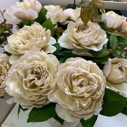 Charlotte Perriand is a very unique shrub cut rose from Japan. The petals of this rose have a special metallic texture, as if coated with a layer of silver powder. The flower color is a mixture of light gray, apricot, and light brown, and it changes with temperature and its flowering stage. The flower (3-4 inch diameter) has a slight fragrance and a long flowering period.