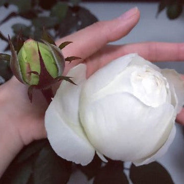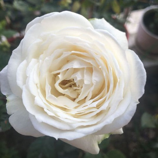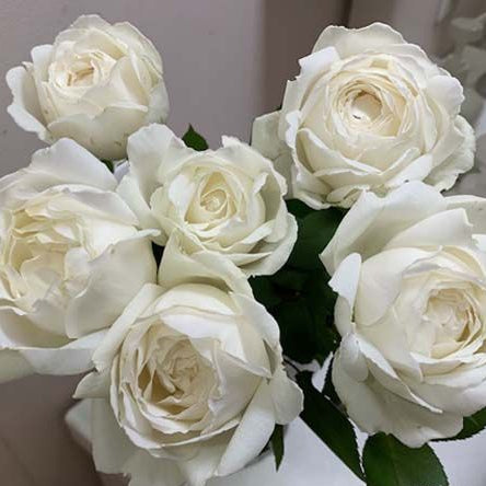 A cut rose with white flowers, ~3 inch in diameter, bun to cup shape, blooms repeatedly through seasons, strong fragrance, plant height 3-4 ft, a very good choice if you are looking for a white color rose.