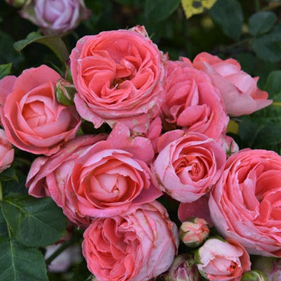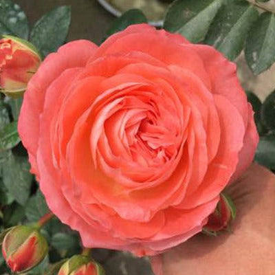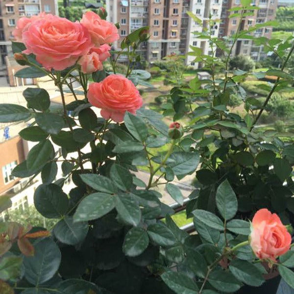 Nova King Terrazza, also known as Salmon Red Balcony, has red flowers with a diameter ~ 3 inch. It has strong fruity fragrance. It is a compact rose in the balcony series. The plant grows to ~1.5 ft. It produces a large number of flowers with multiple blooms and repeats blooming in multiple seasons. It is highly disease-resistant, thornless, and has a low-growing habit, making it ideal for planting on balconies.