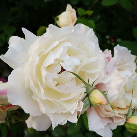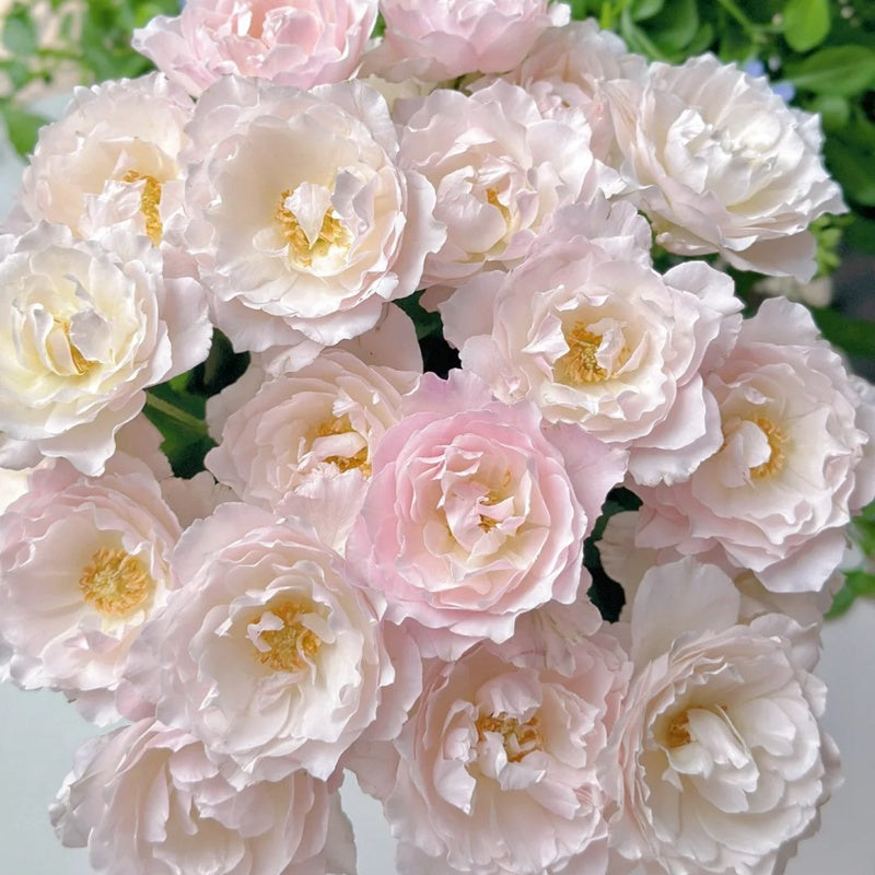 This lovely Japanese rose has pale pink or white flowers (changing colors with temperature and flowering stage), ~3 inch in diameter, with a light fruity fragrance. A floribunda rose that blooms repeatedly throughout the seasons, opening in clusters. Gentle and elegant, the plant grows to 3-5 ft tall and is vigorous and easy to grow.
