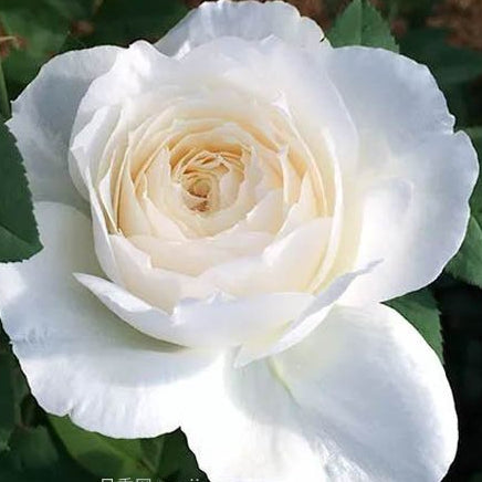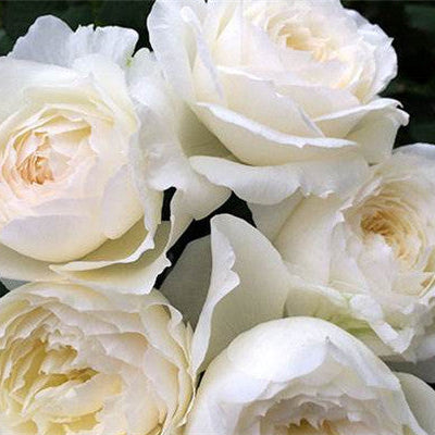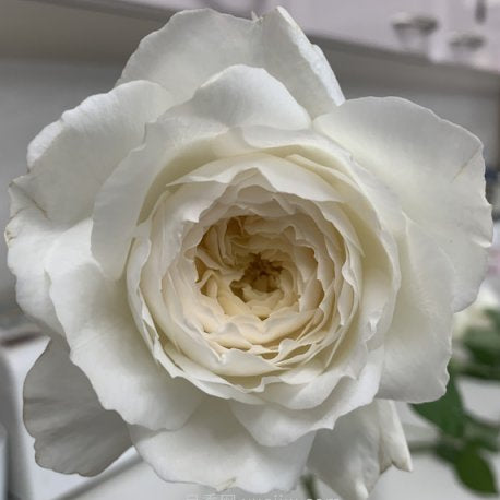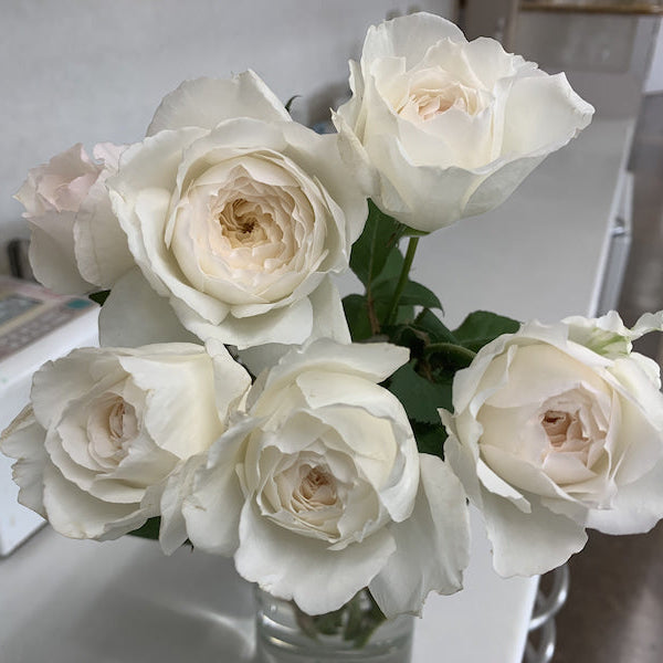 A beautiful cut flower rose, with white or creamy white flowers, ~3 inch in diameter, blooms repeatedly through seasons, has a strong fruity fragrance, grows to 3-4 ft tall, and has a horizontal growth habit.