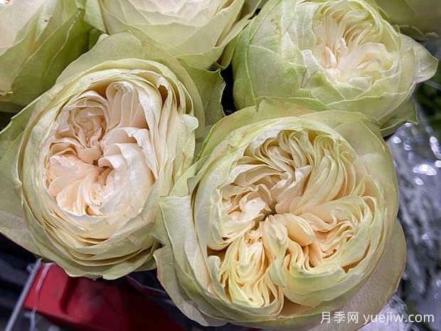 A very unique cut rose, White Kahala has white flowers with light green outer layers, 3-4 inch in diameter, blooms repeatedly through seasons, light tea fragrance, plant height 3-4 ft.